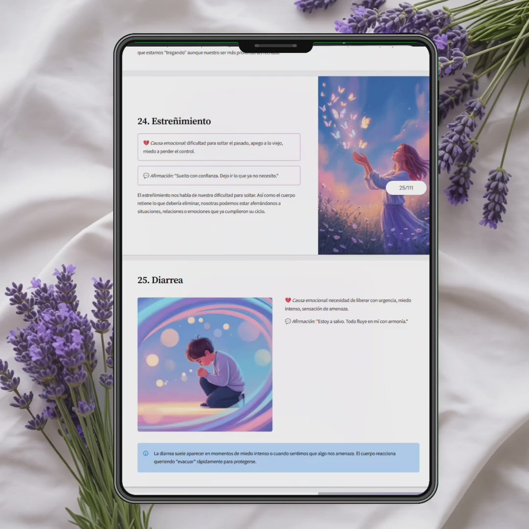 💌 Incluye la biodescodificación de más de 100 enfermedades con su causa emocional, afirmaciones para sanar, ejercicios de introspección y un enfoque hecho para mujeres reales como vos.